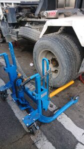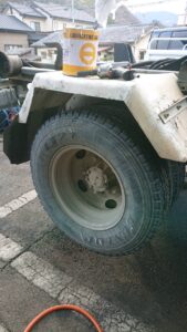 トラックのタイヤは重たいので専用ジャッキで安全に取り外し!!